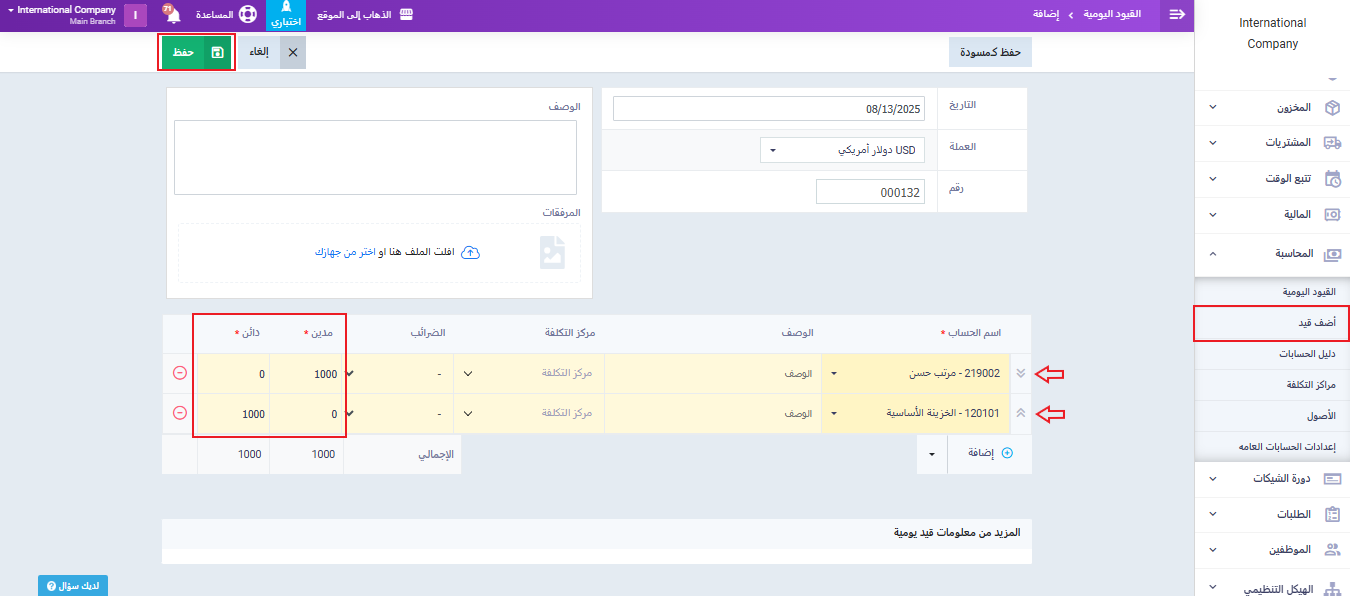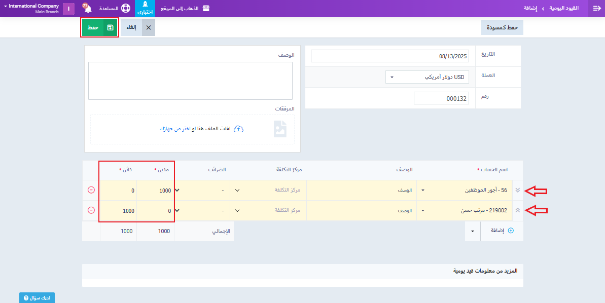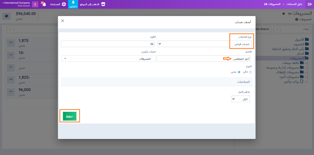 وقم بإنشاء حساب فرعي باسم “أجور الموظفين“. اضغط على زر “حفظ“.
