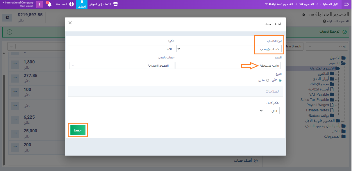 ثم أنشئ حسابًا رئيسيًا جديدًا وليكن على سبيل المثال باسم “رواتب مستحقة“.