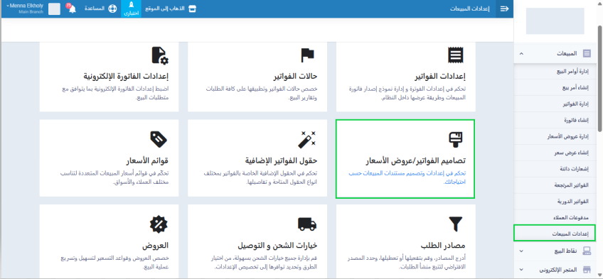 للذهاب إلى قوالب فواتير المبيعات للتعديل على التصميمات اضغط على “إعدادات المبيعات” المنسدلة عن “المبيعات” بالقائمة الرئيسية، ثم اضغط على “تصاميم الفواتير/عروض الأسعار”.