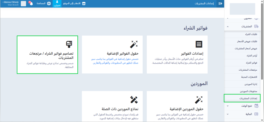 للذهاب إلى قوالب فواتير الشراء، اضغط على “إعدادات فواتير الشراء” المنسدلة عن “المشتريات”. ثم اضغط على “تصاميم فواتير الشراء/ مرتجعات المشتريات”.
