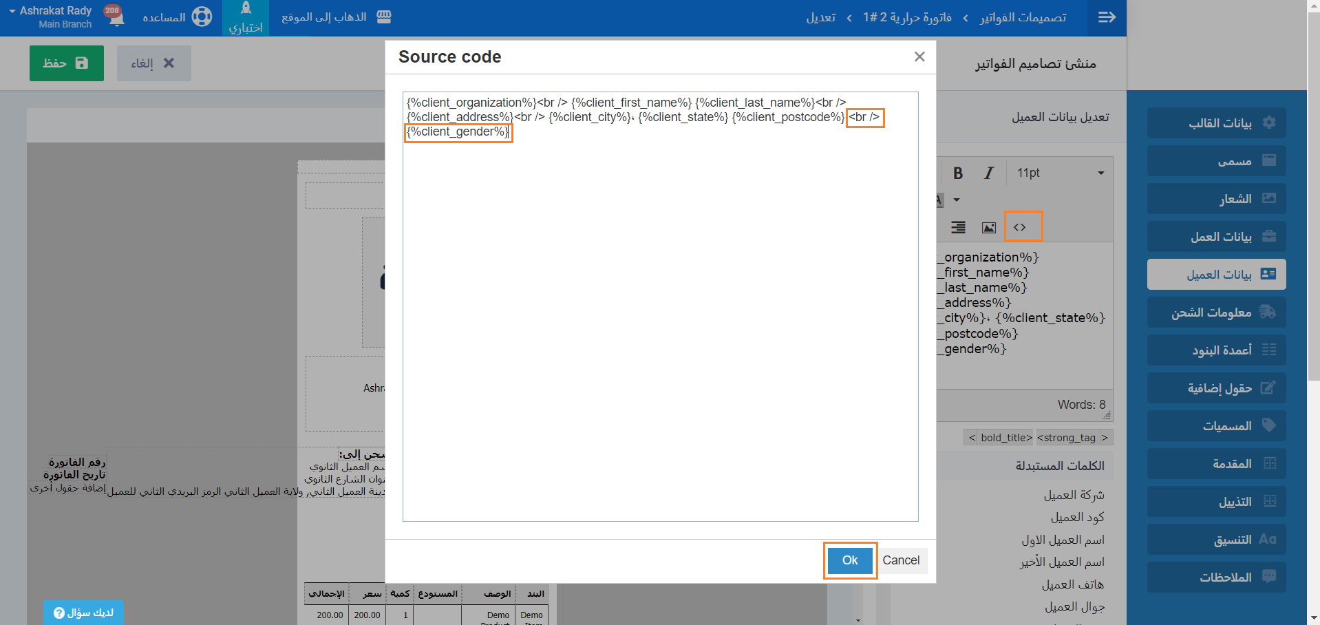كما يمكنك التحكم في ترتيب المتغير أو طريقة عرضه وموضعه في قالب الفاتورة من خلال الأكواد، وهو ما يتيح لك تعديلات أكثر مرونة وسعة، اضغط على زر “مصدر الكود Source code” لتعديل الكود <>