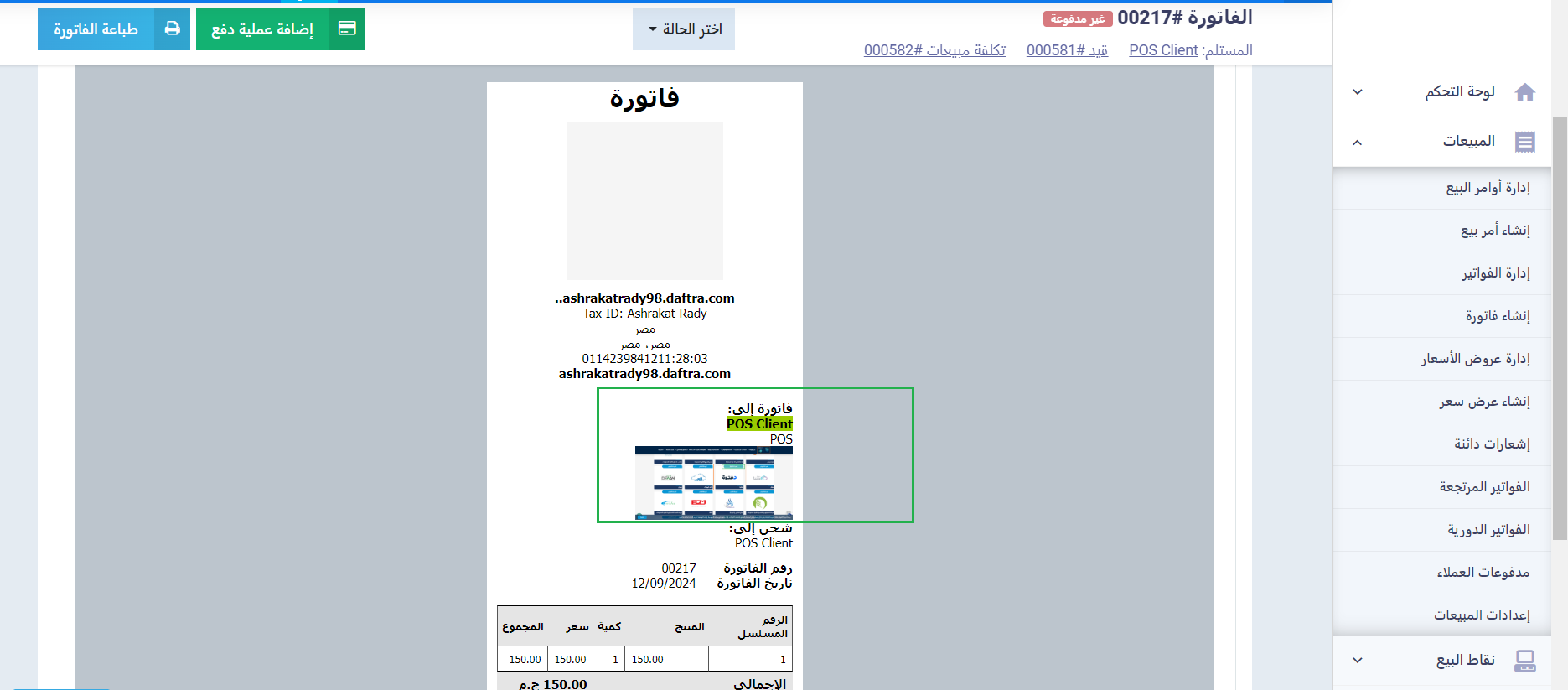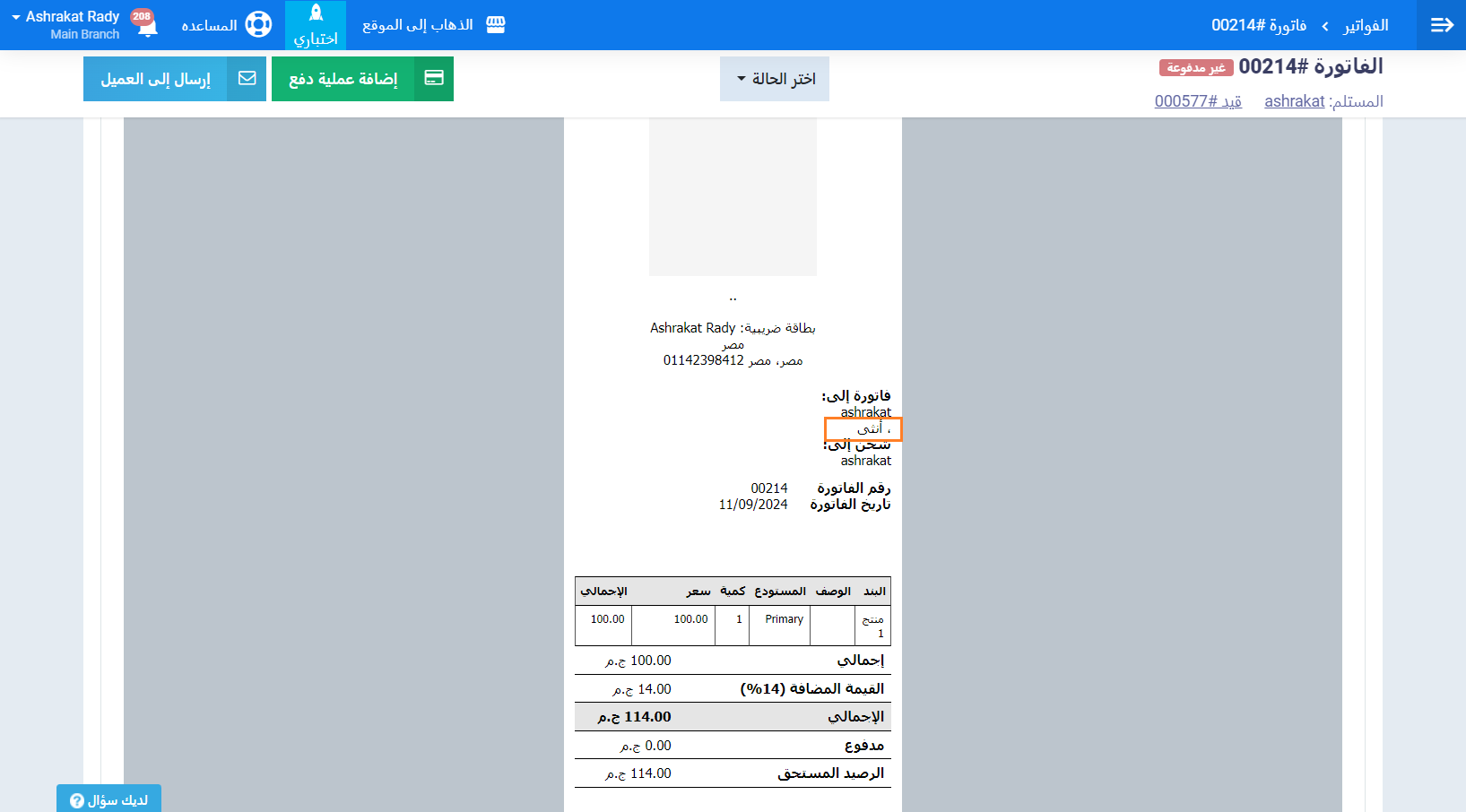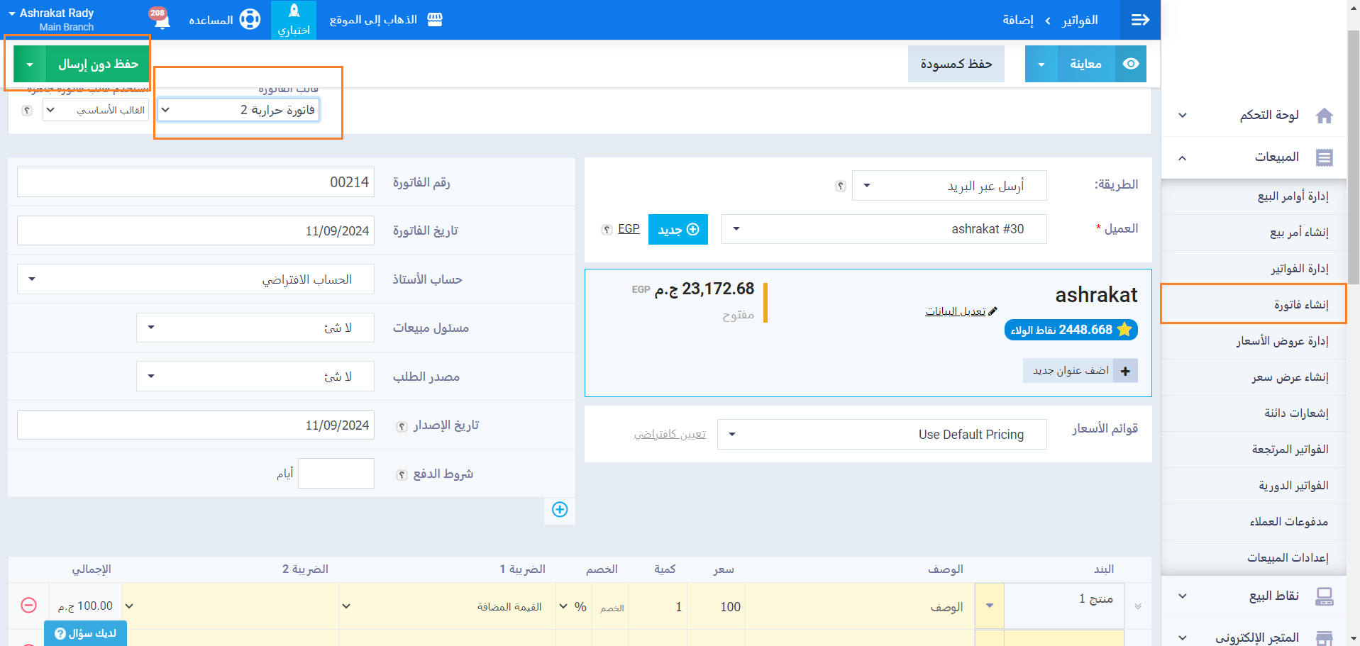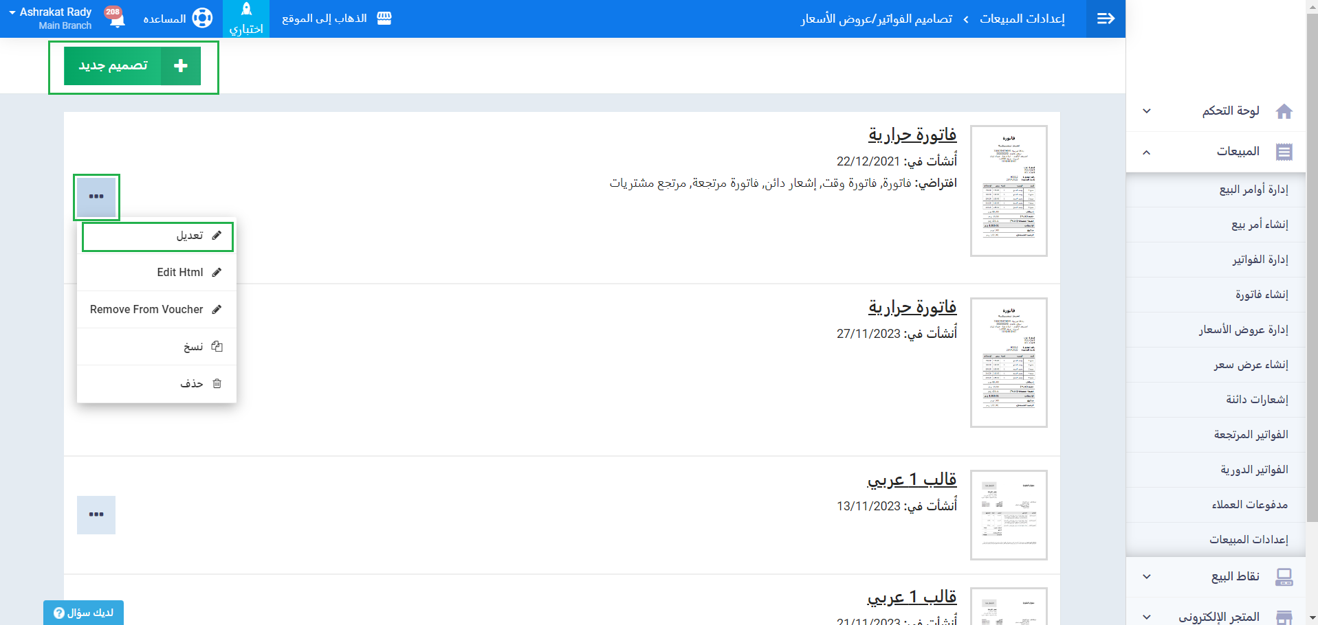 نذهب لإنشاء فاتورة ونستخدم نفس القالب الذي قمنا بتعديله.