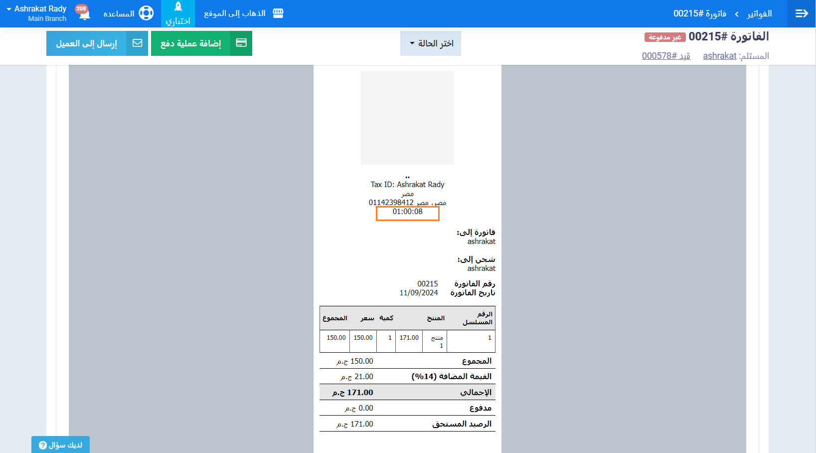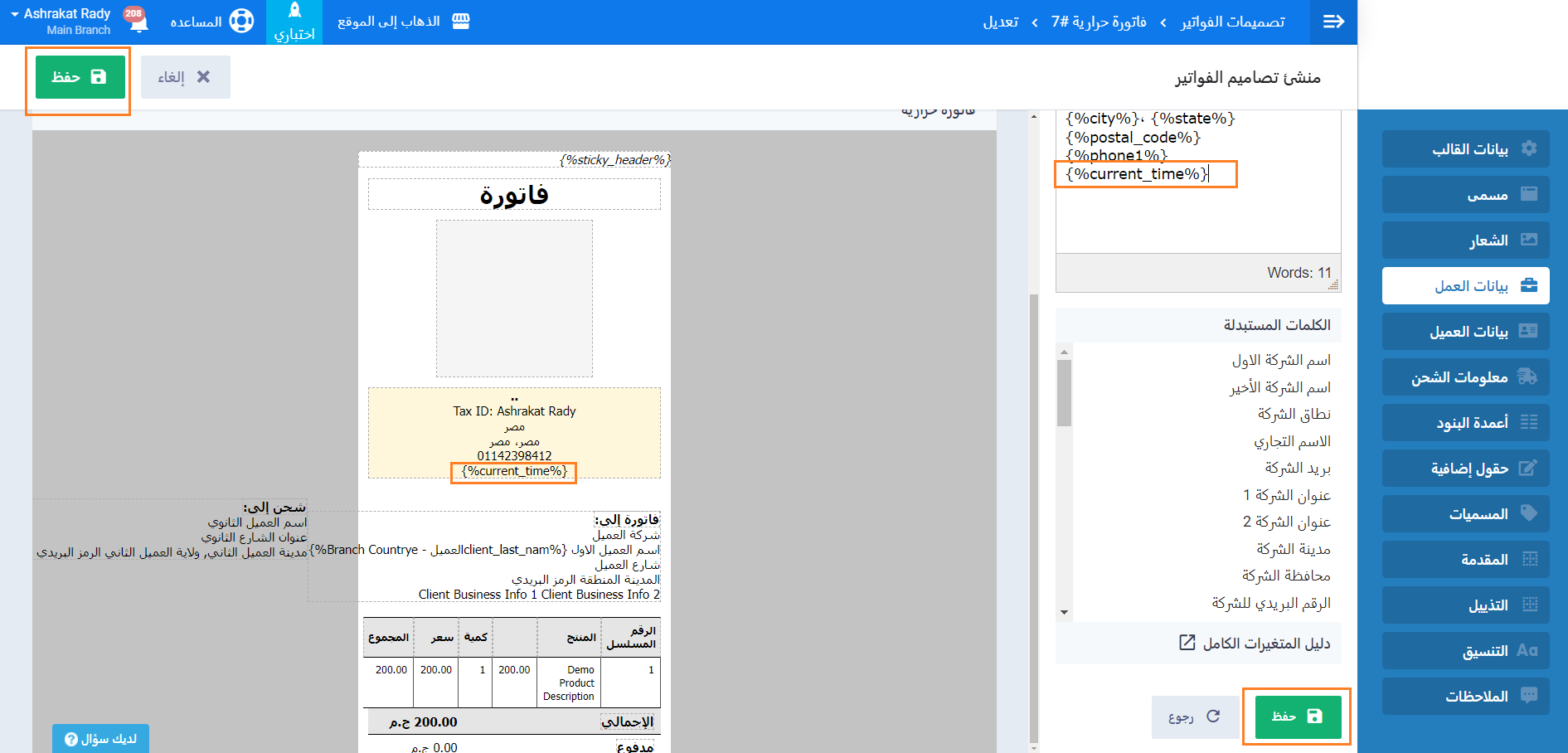لنجد متغير الوقت الحالي الذي أضفناه من “دليل المتغيرات الكامل” قد ظهر بعد حفظ الفاتورة.