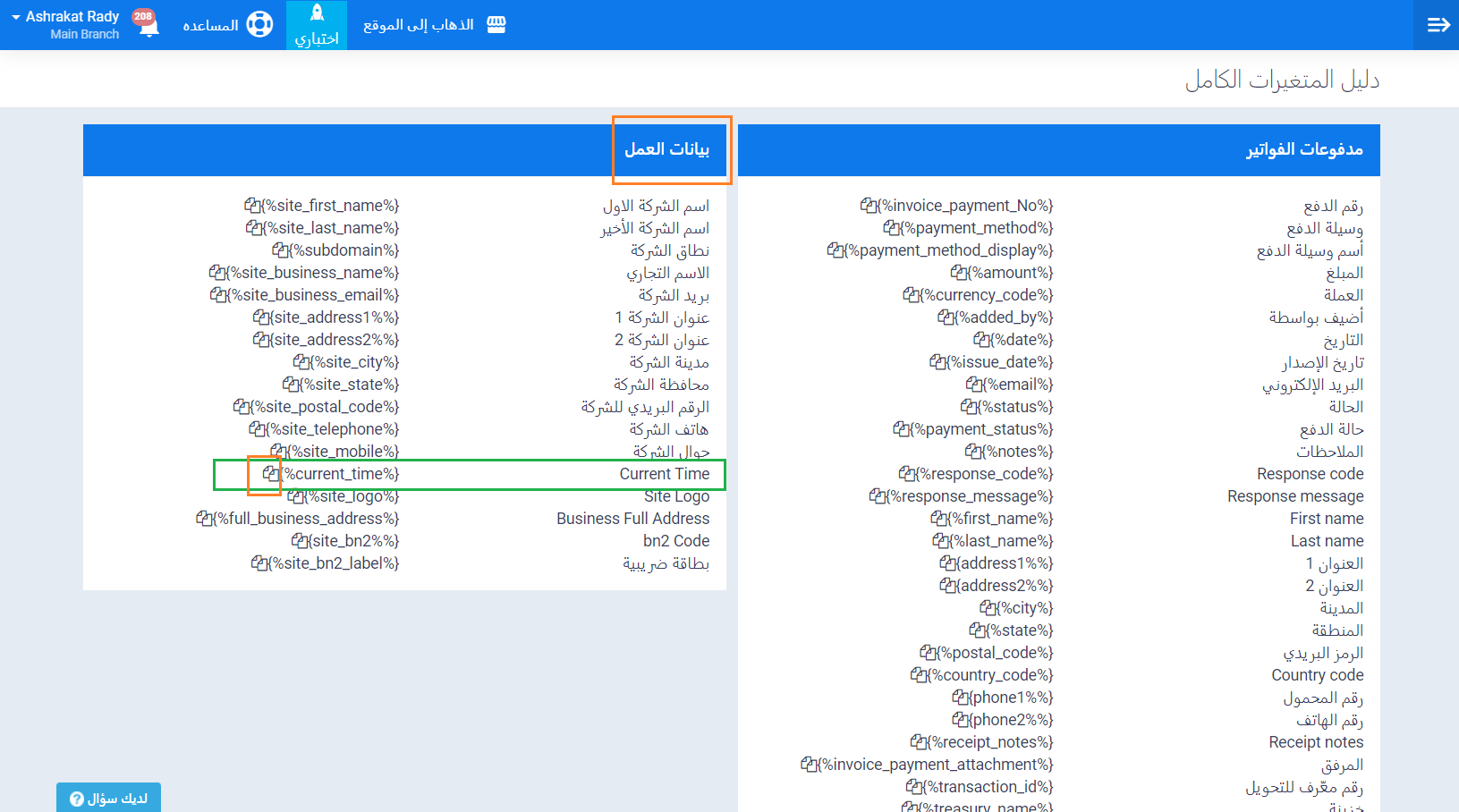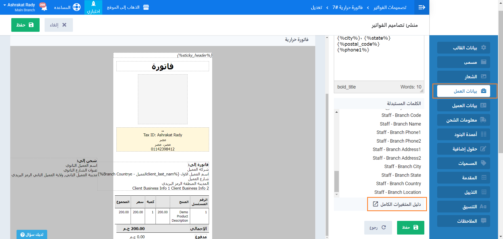 كيفية إضافة المتغيرات في قالب الفاتورة