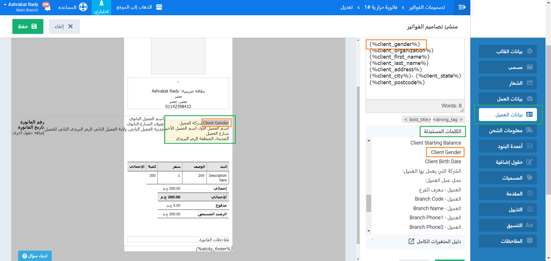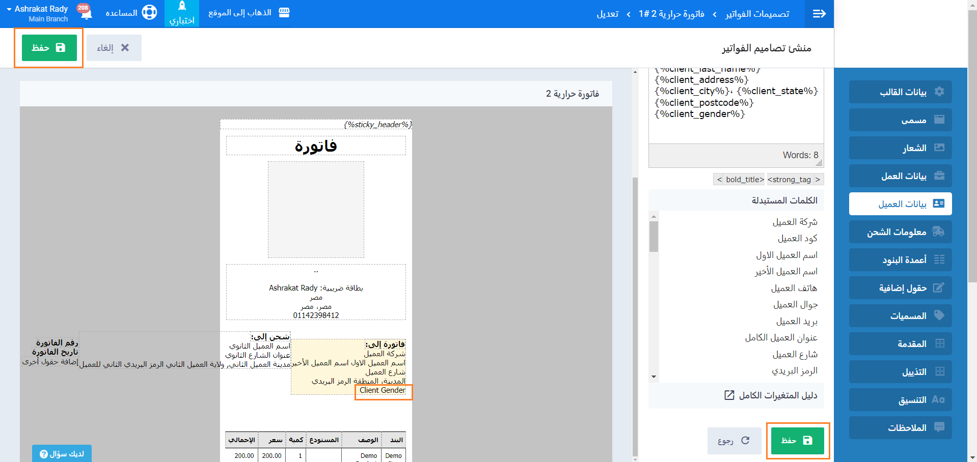 لاحظ في هذا المثال قمنا بنقل مكان المتغير الخاص بنوع العميل Client gender ليظهر كأخر المتغيرات الموجودة معه في نفس القسم في قالب الفاتورة.