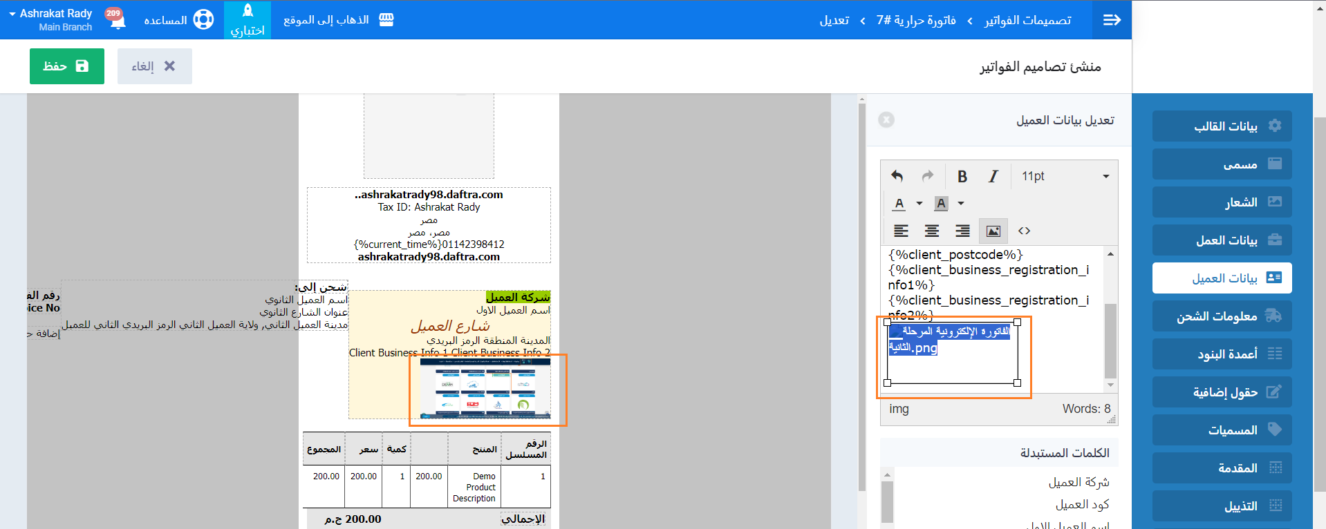 تظهر المتغيرات والصور بالشكل التالي في الفاتورة، إذ تلاحظ تطابق التنسيق الظاهرة به لما تم ضبطه من خلال أدوات التنسيق.