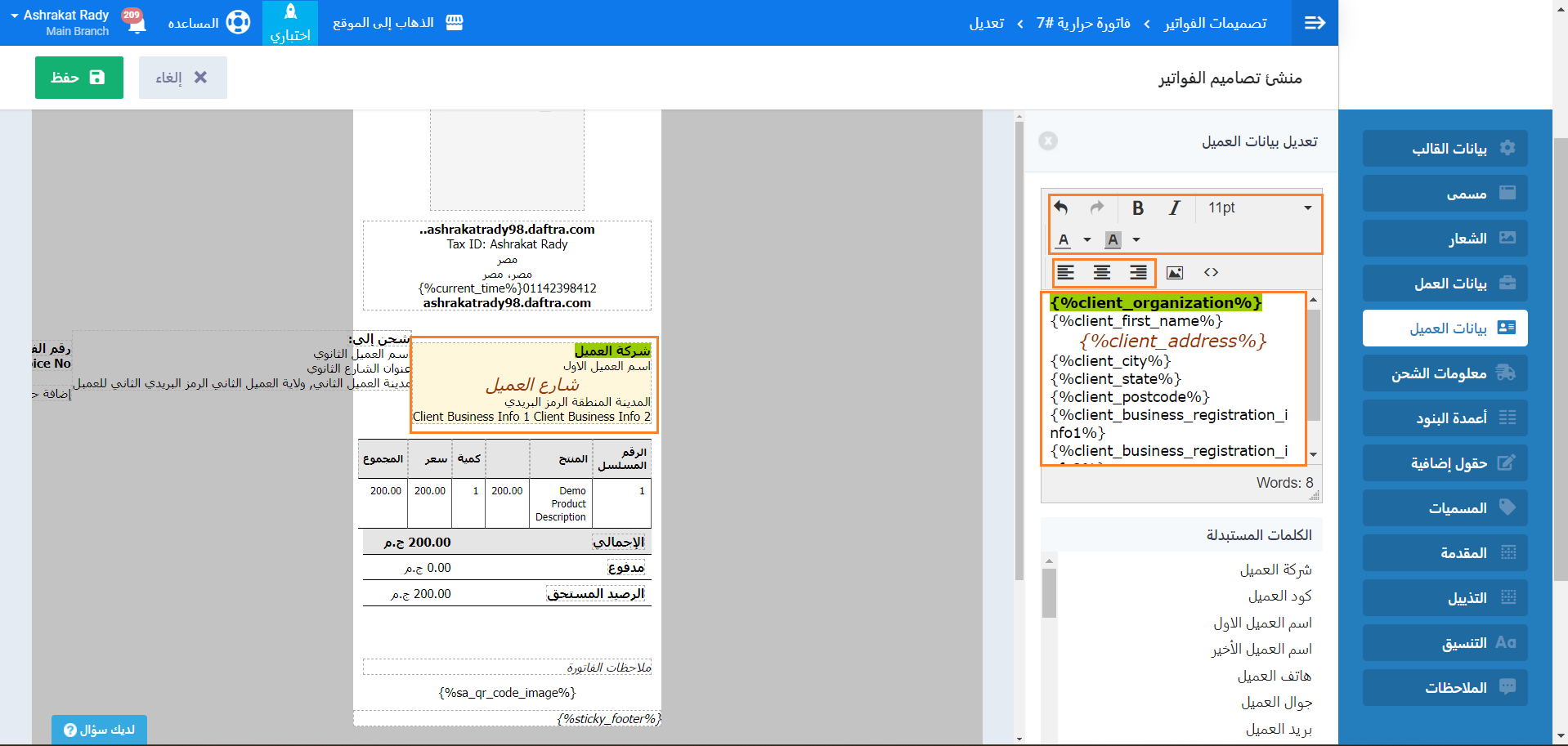 ثم اضغط على المتغير المراد من قائمة “الكلمات المستبدلة”، لتجد المتغير ظهر فورًا في قالب الفاتورة محدد مكانه؛ كما سيظهر عند استخدام هذا القالب لإنشاء الفواتير.