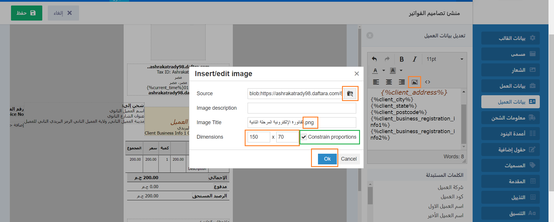 إن أردت إضافة صورة إلى قالب الفاتورة، اضغط على أداة إضافة الصور من أدوات التنسيق واختر الصورة المراد إظهارها في قالب الفاتورة من جهاز الكمبيوتر أو بلصق رابط الصورة واضبط حجمها ثم اضغط على زر “ok”.