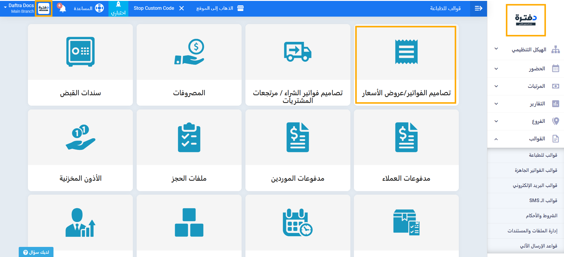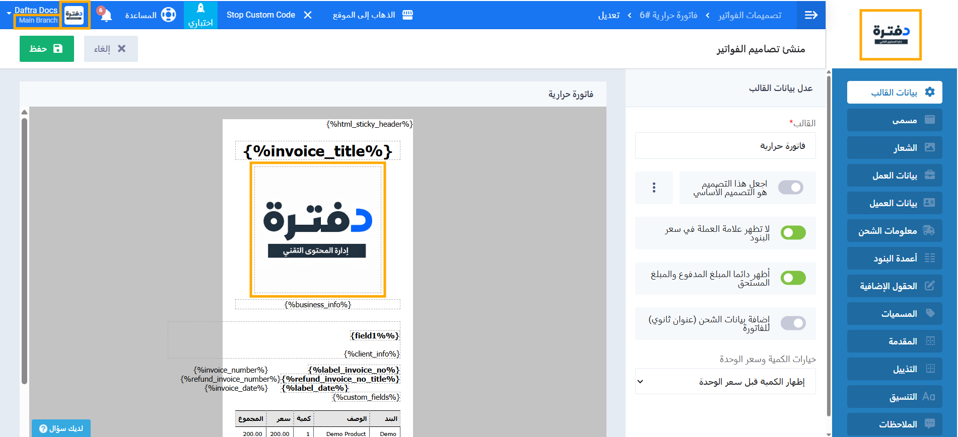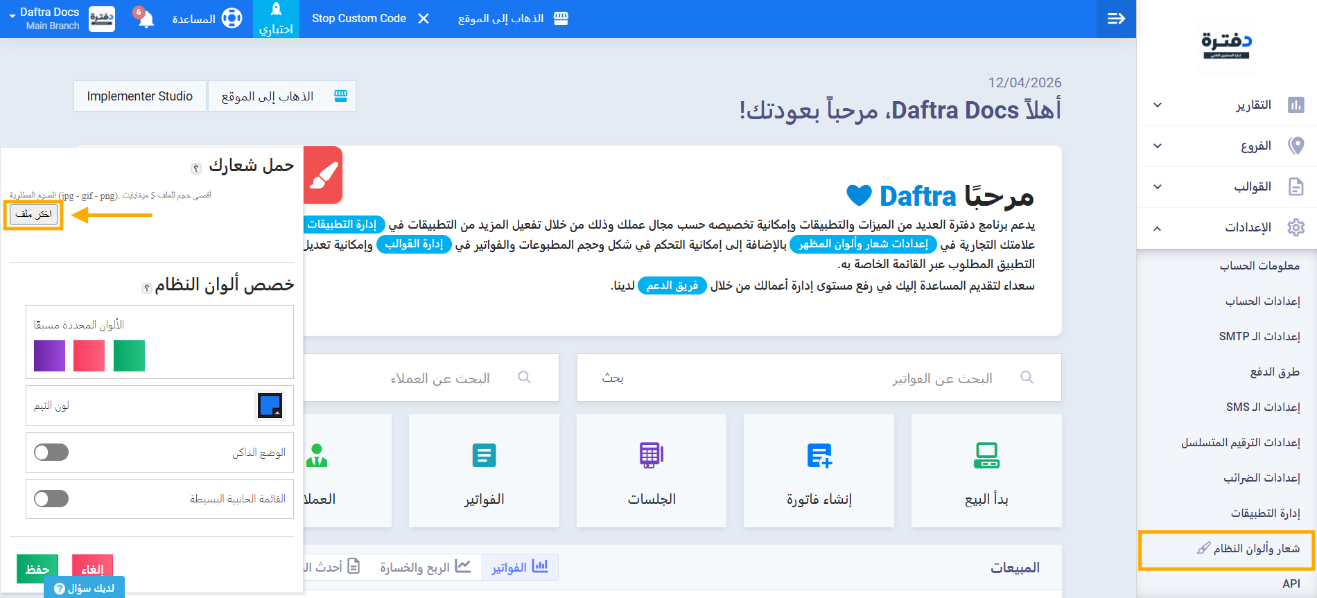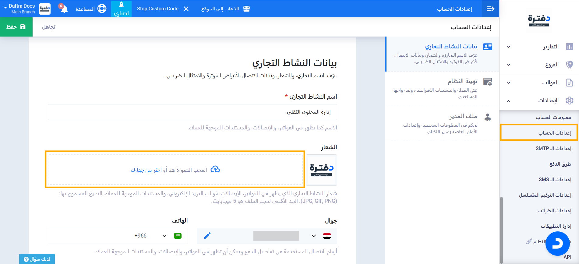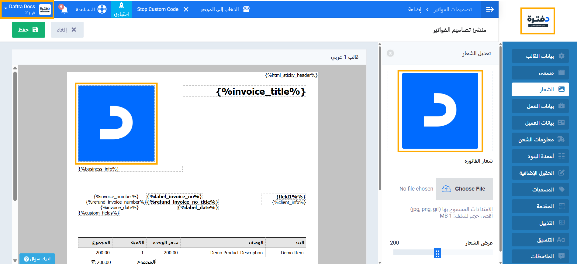 - إضافة شعار عام لجميع الفروع وقوالب الفواتير على دفترة.