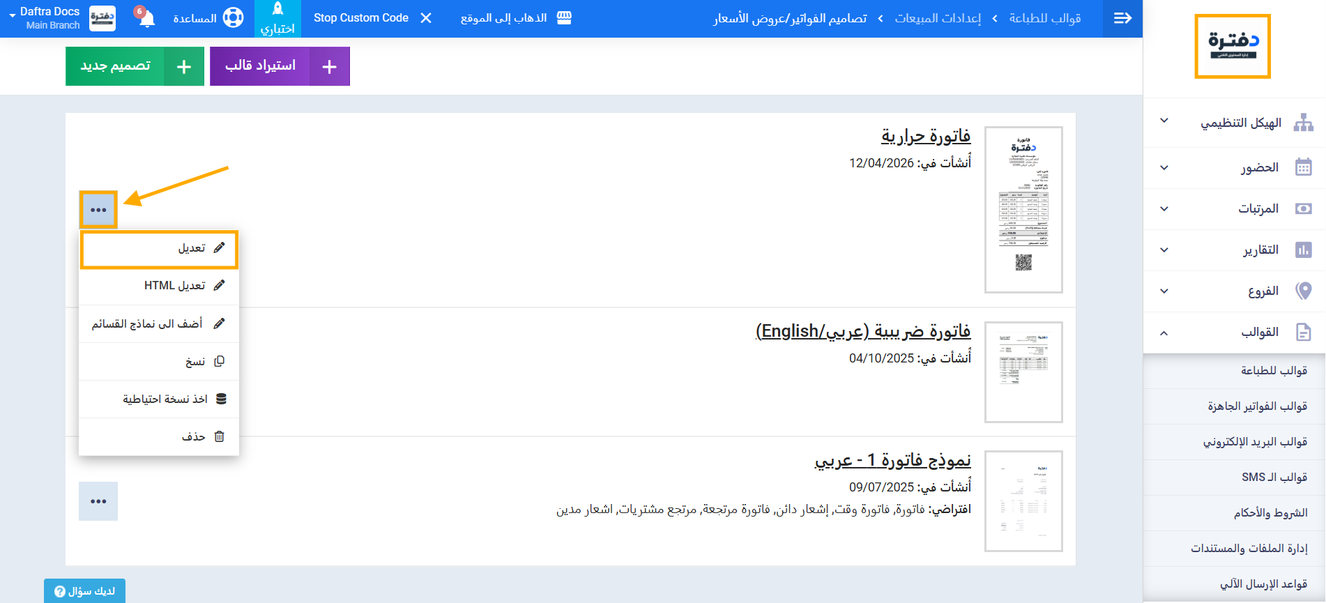 اضغط على الثلاث نقاط بجوار أي قالب للفواتير ثم اضغط على “تعديل” لاستعراض القالب والشعار المضمن في التصميم.