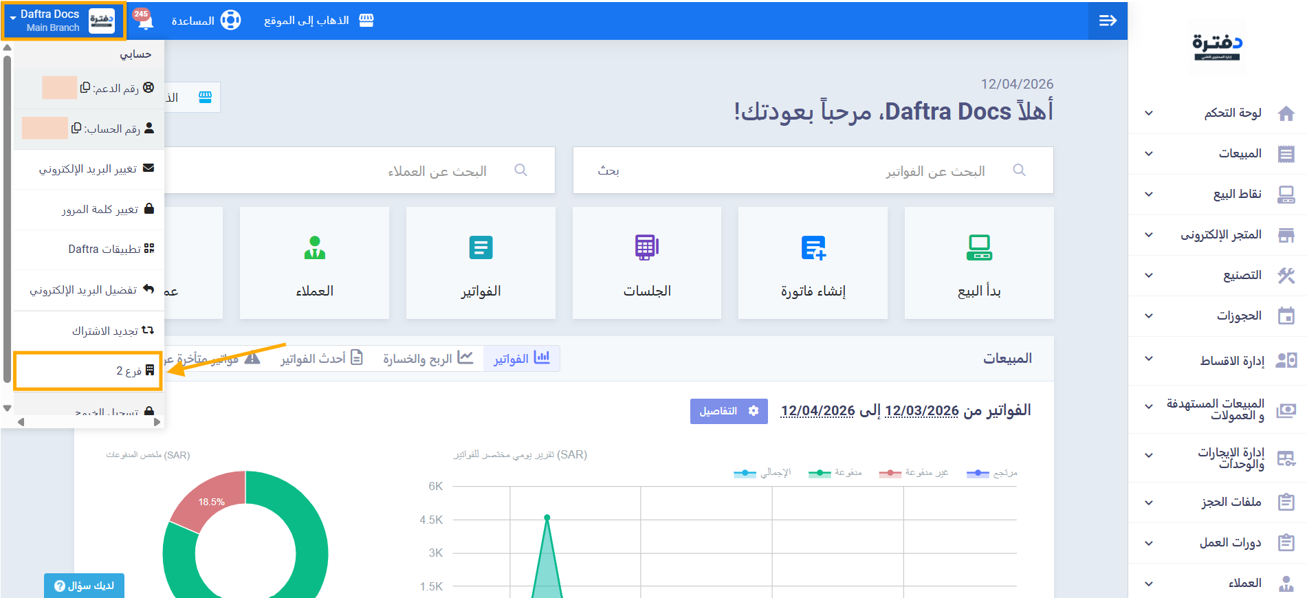 لتغيير شعار قالب الفاتورة في أحد الفروع، اضغط على اسم الحساب الخاص بك أعلى يسار الشاشة واختر من القائمة المنسدلة اسم الفرع المراد وليكن “فرع 2”.