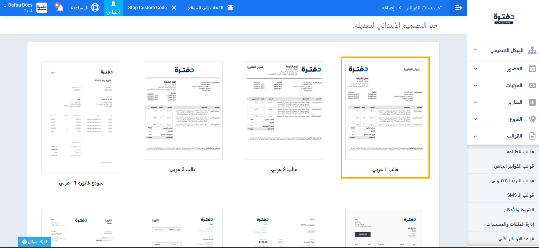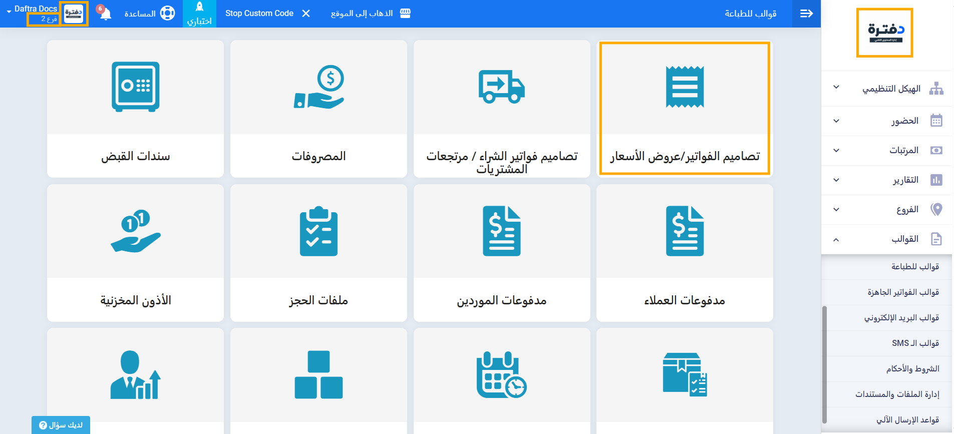اضغط على “قوالب للطباعة” المنسدلة عن “القوالب” بالقائمة الرئيسية ثم اضغط على “تصاميم الفواتير/ عروض الأسعار”.