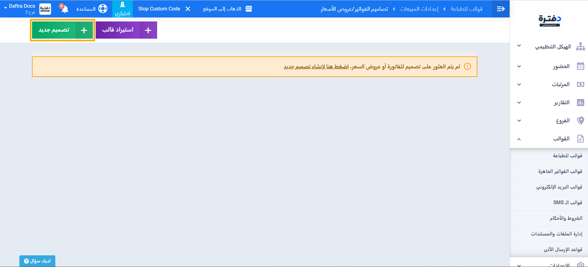 اضغط على زر “تصميم جديد” لإضافة قوالب الفاتورة المراد إضافتها لهذا الفرع حيث لا توجد قوالب مضافة مسبقًا.