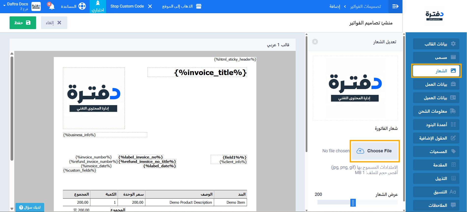 اضغط على “اختر ملف Choose file” واختر من جهازك الشعار المراد تضمينه بقالب فواتير الفرع 2