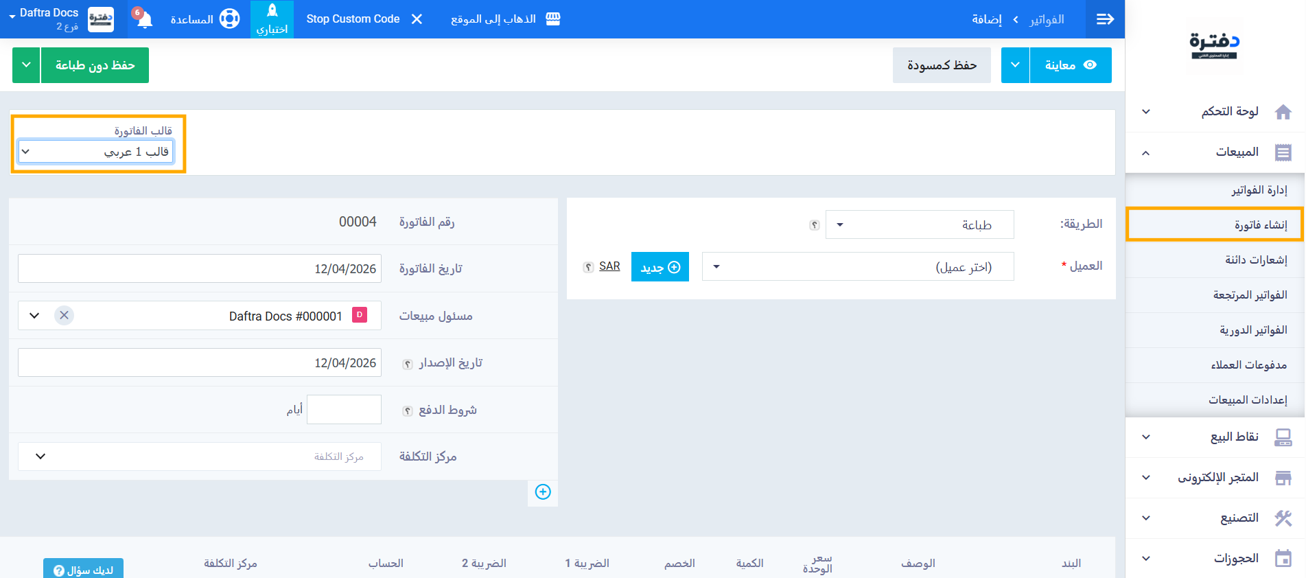 اضغط على “إنشاء فاتورة” المنسدلة عن “المبيعات” بالقائمة الرئيسية لإنشاء فاتورة جديدة داخل الفرع 2، وتأكد من اختيار القالب الذي أضفنا له شعار الفرع 2 من القائمة المنسدلة عن حقل قالب الفاتورة، واستكمل البيانات ثم اضغط على زر “حفظ”.