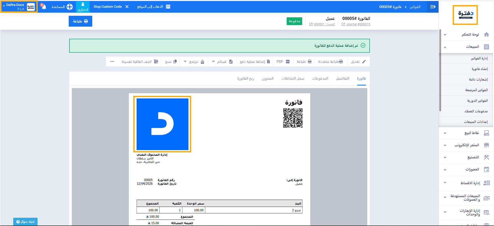لاحظ ظهور شعار الفرع داخل الفاتورة.