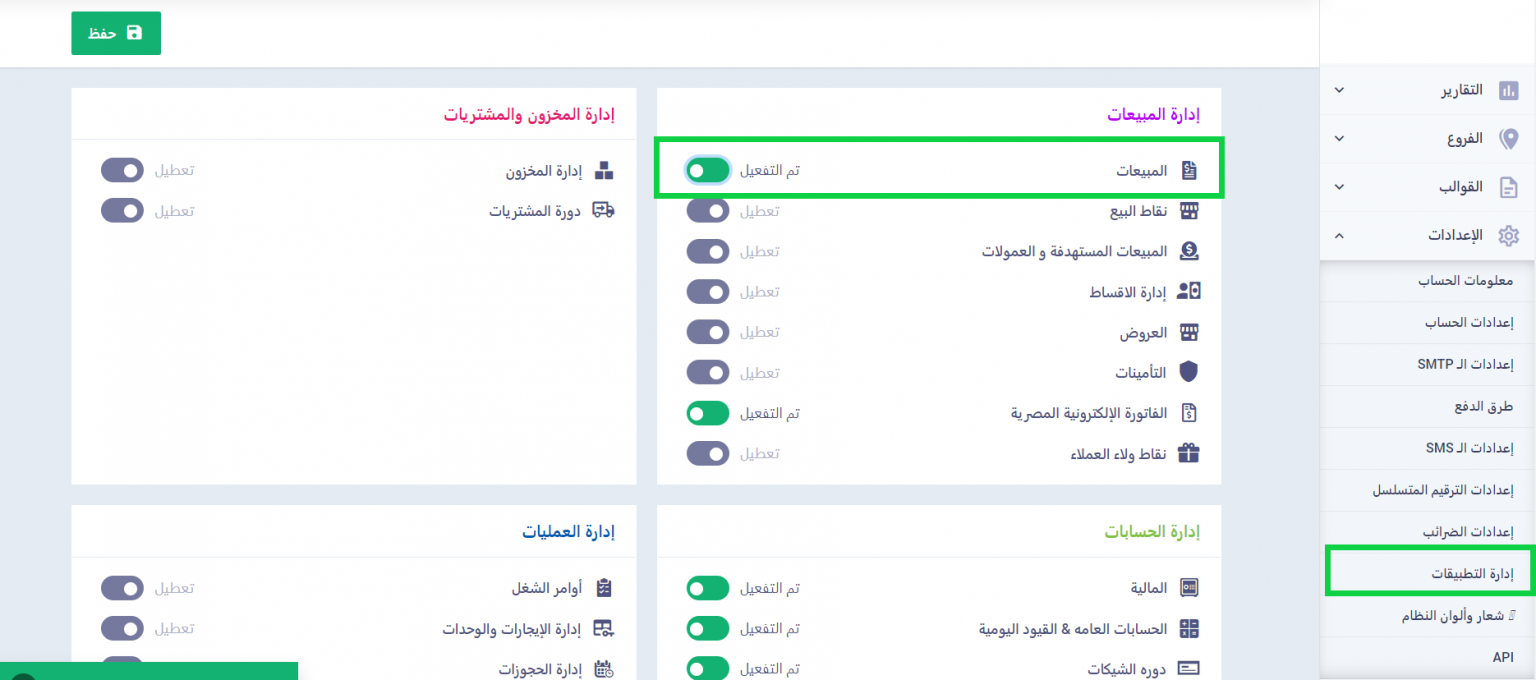 لكي تتمكن من إنشاء الفاتورة تأكد أولًا من تفعيل “تطبيق المبيعات” من “إدارة التطبيقات”.