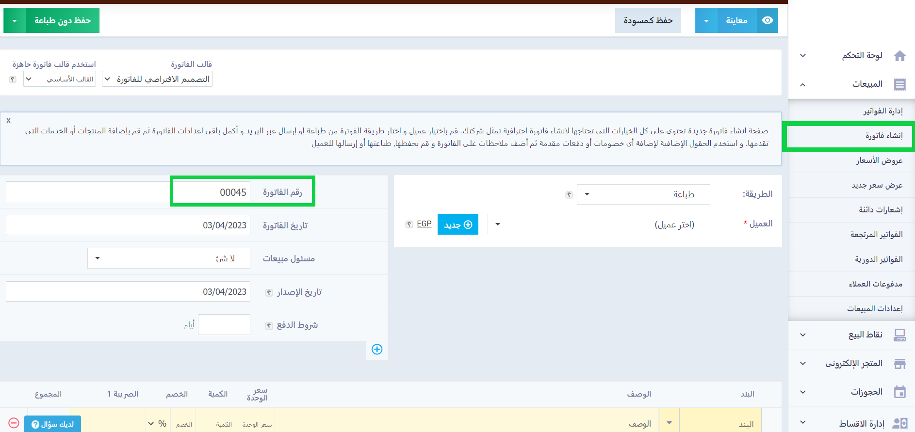 - خانة العميل تساعدك على اختيار العميل صاحب الفاتورة من قاعدة بيانات العملاء بالنظام أو يمكنك أن تقوم بإضافة عميل جديد من الزر بجانبها.