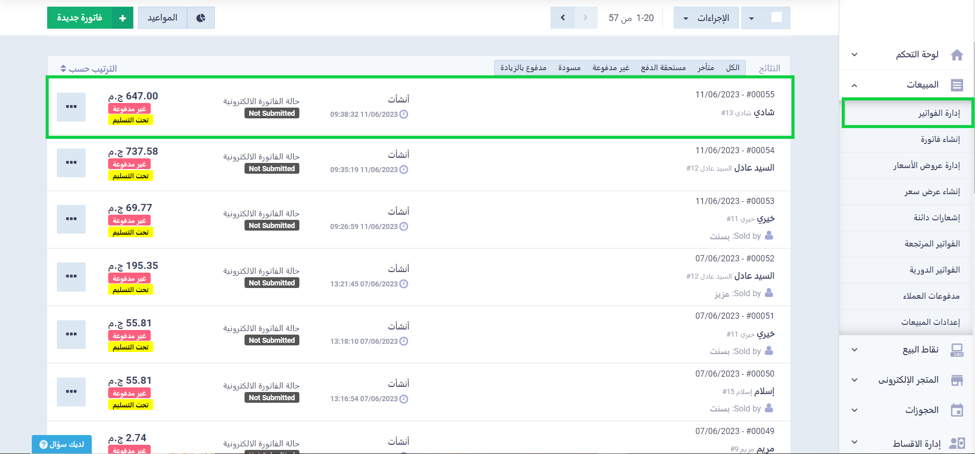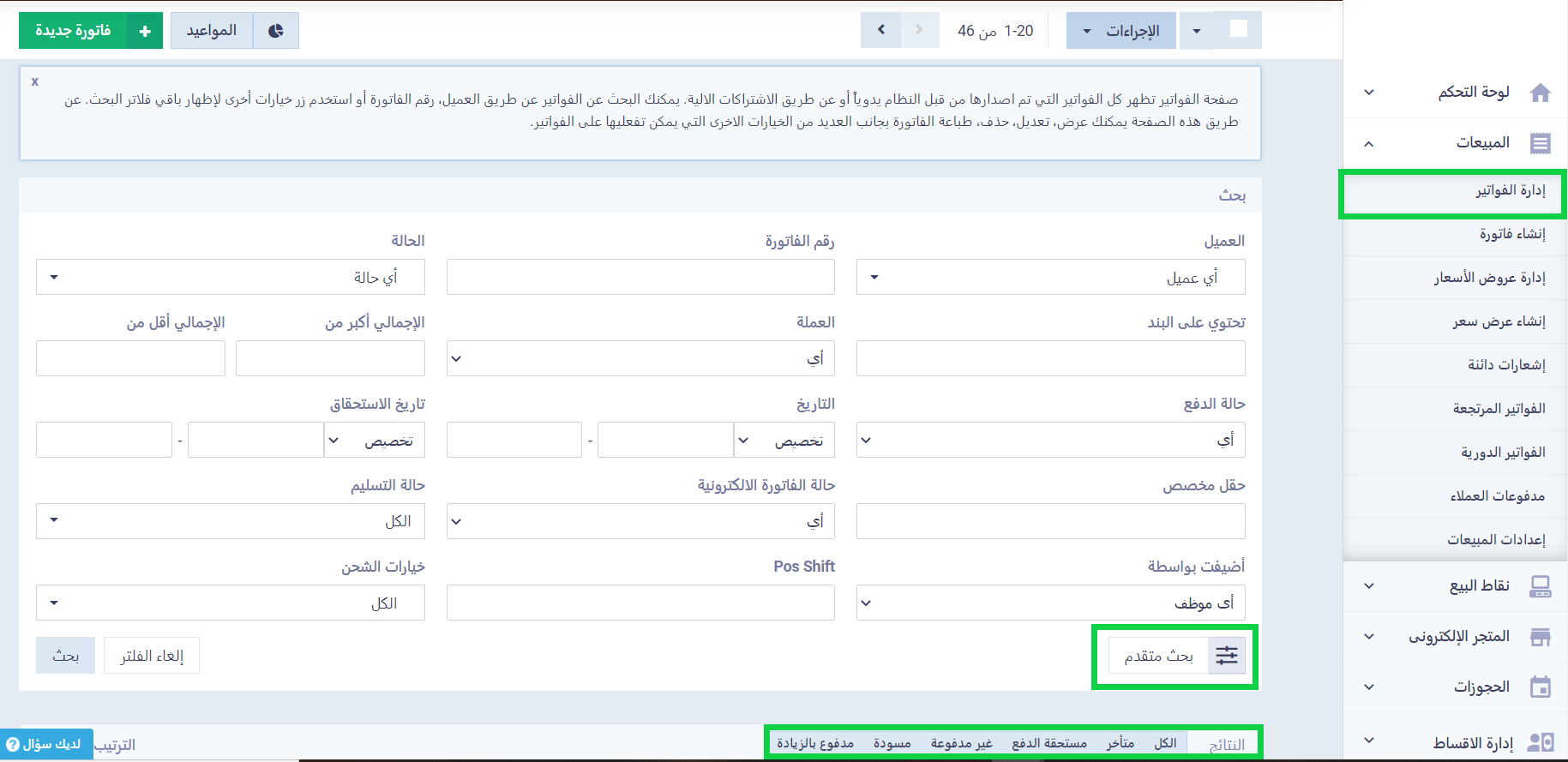 من خلال “إدارة الفواتير” المنسدلة عن “المبيعات” بالقائمة الرئيسية يمكنك استعراض قائمة الفواتير كلها، مع إمكانية استخدام فلاتر البحث والحالات المختلفة للوصول إلى الفواتير التي تبحث عنها أسرع ولإلقاء نظرة تحليلية على فئة محددة من فواتيرك، كما يمكنك اتخاذ بعض الإجراءات السريعة أو ترتيب ميعاد أو لاختيار فاتورة ما والانتقال إلى قائمة الإجراءات الشاملة، كما يمكنك إنشاء فاتورة جديدة.