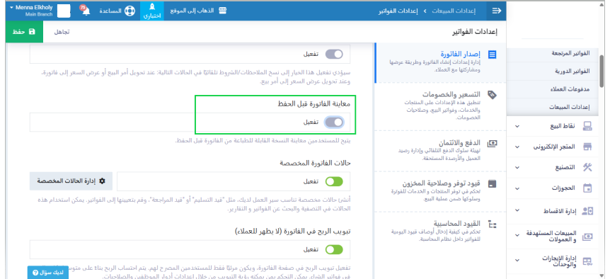 ولكن في حالة عدم رغبتك تفعيل هذه الخاصية لكي لا يتاح الحصول على أي نسخة أو شكل نهائي للفاتورة دون الحفظ النهائي، يمكنك التوجه إلى “إعدادات المبيعات” المنسدلة عن “المبيعات” بالقائمة الرئيسية ثم اختيار “إعدادات الفواتير”، ومنها قم بإلغاء تفعيل خاصية “معاينة الفاتورة قبل الحفظ”.