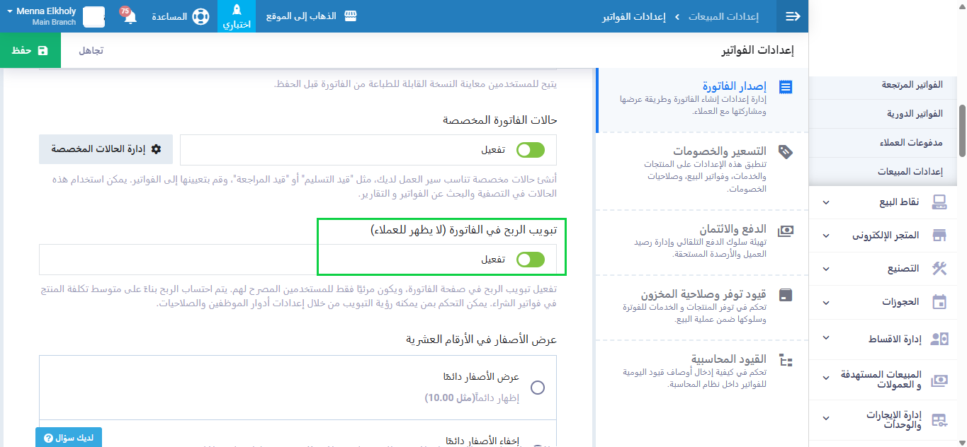 فعّل خاصية “إظهار ربح الفاتورة” واضغط “حفظ”.