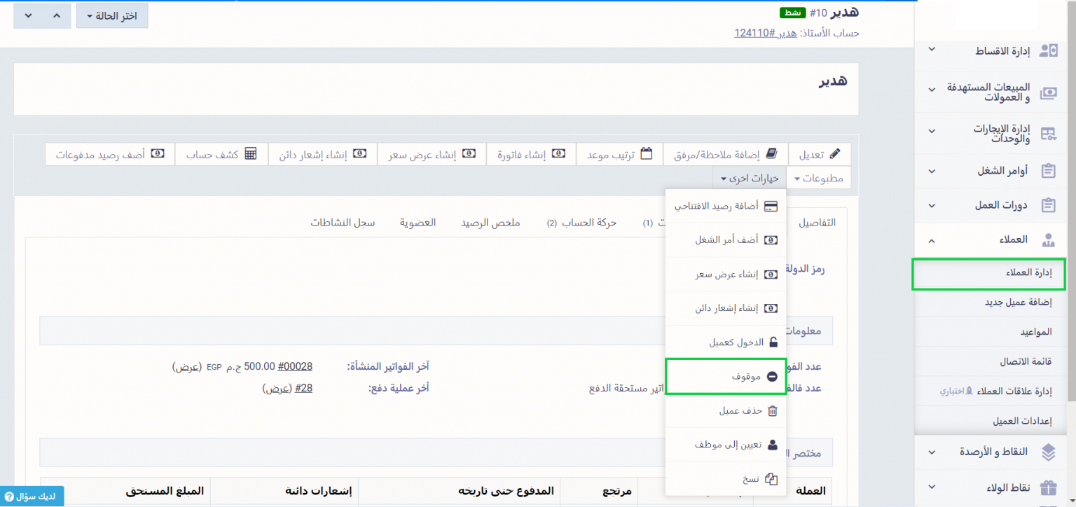 اضغط على “إدارة العملاء” المنسدلة “العملاء” بالقائمة الرئيسية، واضغط على الملف الشخصي للعميل المراد إيقافه.