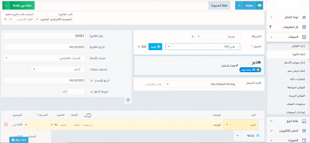 بعد الإيقاف لن يمكنك إجراء أي تعاملات مع العميل كإصدار الفواتير له، توجه مثلًا إلى “إنشاء فاتورة” المنسدلة عن “المبيعات” بالقائمة الرئيسية، واختر العميل الذي تم إيقافه وادخل بنود الفاتورة ثم اضغط على زر “حفظ”.