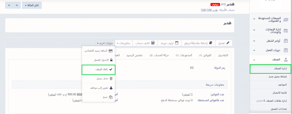 يمكنك استعادة التعاملات مع العميل الموقوف وقتما تشاء، فقط توجه إلى “إدارة العملاء” المنسدلة عن “العملاء” بالقائمة الرئيسية مرة أخرى، ثم اضغط على “خيارات أخرى” واختر “إلغاء الوقف” من القائمة المنسدلة وأكد على رغبتك في إعادة التنشيط.