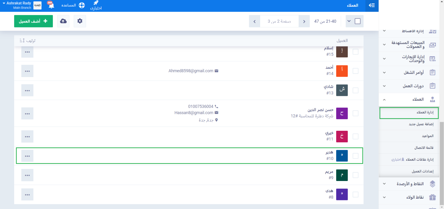 اضغط على “إدارة العملاء” المنسدلة “العملاء” بالقائمة الرئيسية، واضغط على الملف الشخصي للعميل المراد إيقافه.