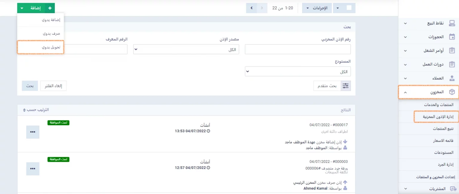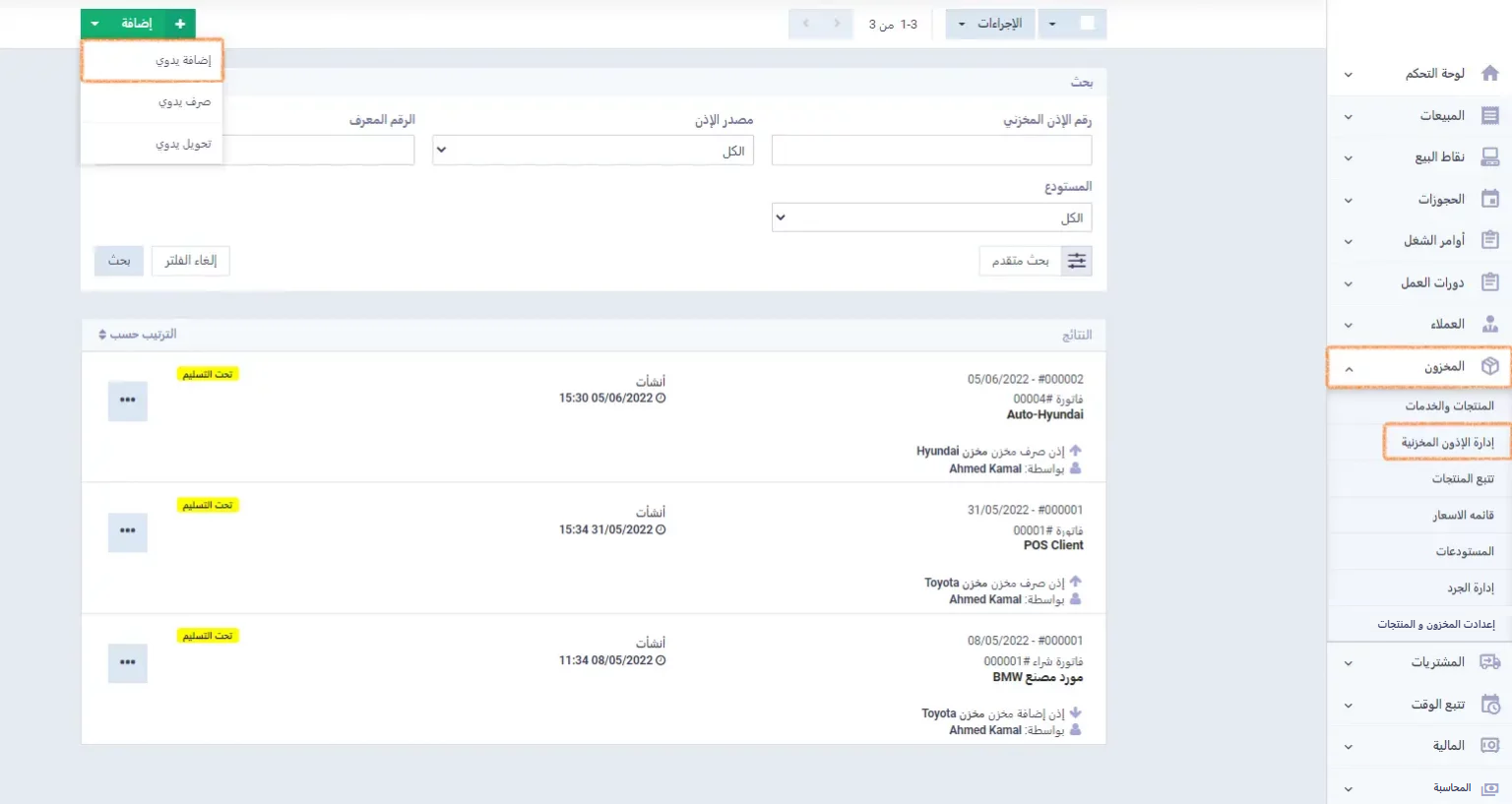 فمثلًا إذا أقدم الموظف هشام على إضافة إذن مخزني يدويًا -من حسابه على البرنامج- بالضغط على “المخزون” من القائمة الرئيسية، ثم “إدارة الأذون المخزنية“، ثم ضغط على الزر الأخضر “إضافة” أعلى يسار لوحة التحكم في الأذون المخزنية، ثم قام باختيار “إضافة يدوي” كما في الصورة: