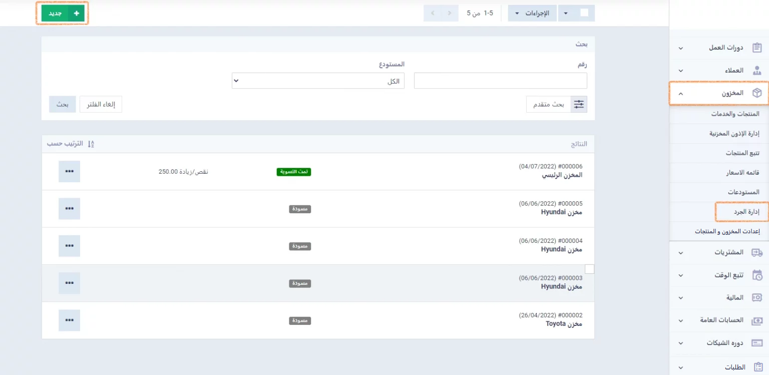 ولكي نقوم بذلك نضغط أولًا على “المخزون” من القائمة الرئيسية، ثم نضغط على “إدارة الجرد“، ثم نضغط على زر “جديد“.
