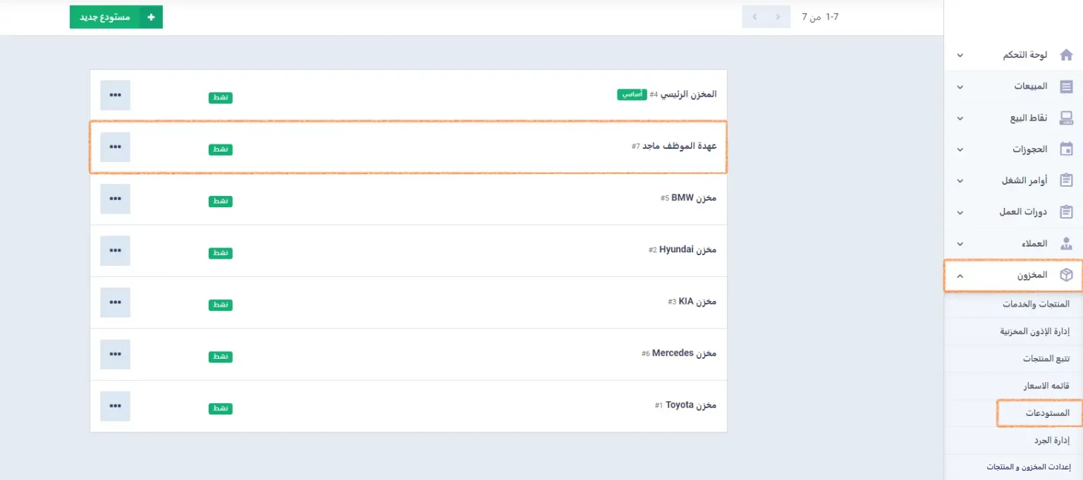لتعيين الصلاحيات للموظف ماجد، نضغط على “المخزون” من القائمة الرئيسية، ثم نضغط على “المستودعات“، ونُحدد المستودع الذي نريد تعيين صلاحياته له وهو “عهدة الموظف ماجد” كما يظهر في الصورة: