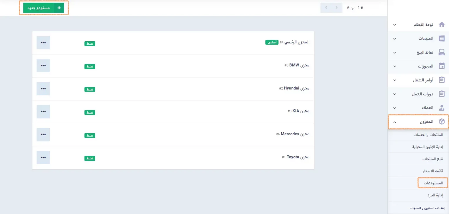 لإنشاء مستودع جديد نضغط أولًا على “المخزون” من القائمة الرئيسية، ثم نضغط على “المستودعات“.
