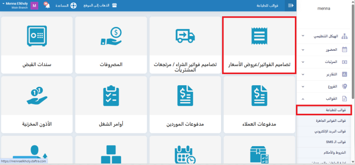 من قائمة “القوالب” اختر “قوالب للطباعة”، ثم اضغط على “تصاميم فواتير وعروض الأسعار” وحدد قالب الفاتورة المطلوب.