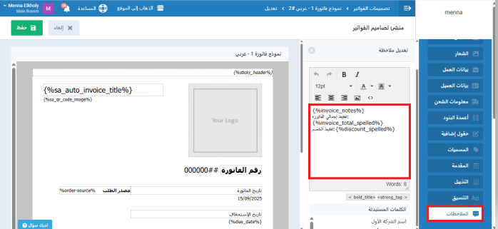 بعد ذلك اضغط على حقل “الملاحظات”، ومن دليل المتغيرات قم بنسخ كود تفقيط إجمالي الفاتورة وألصقه داخل قسم الملاحظات.