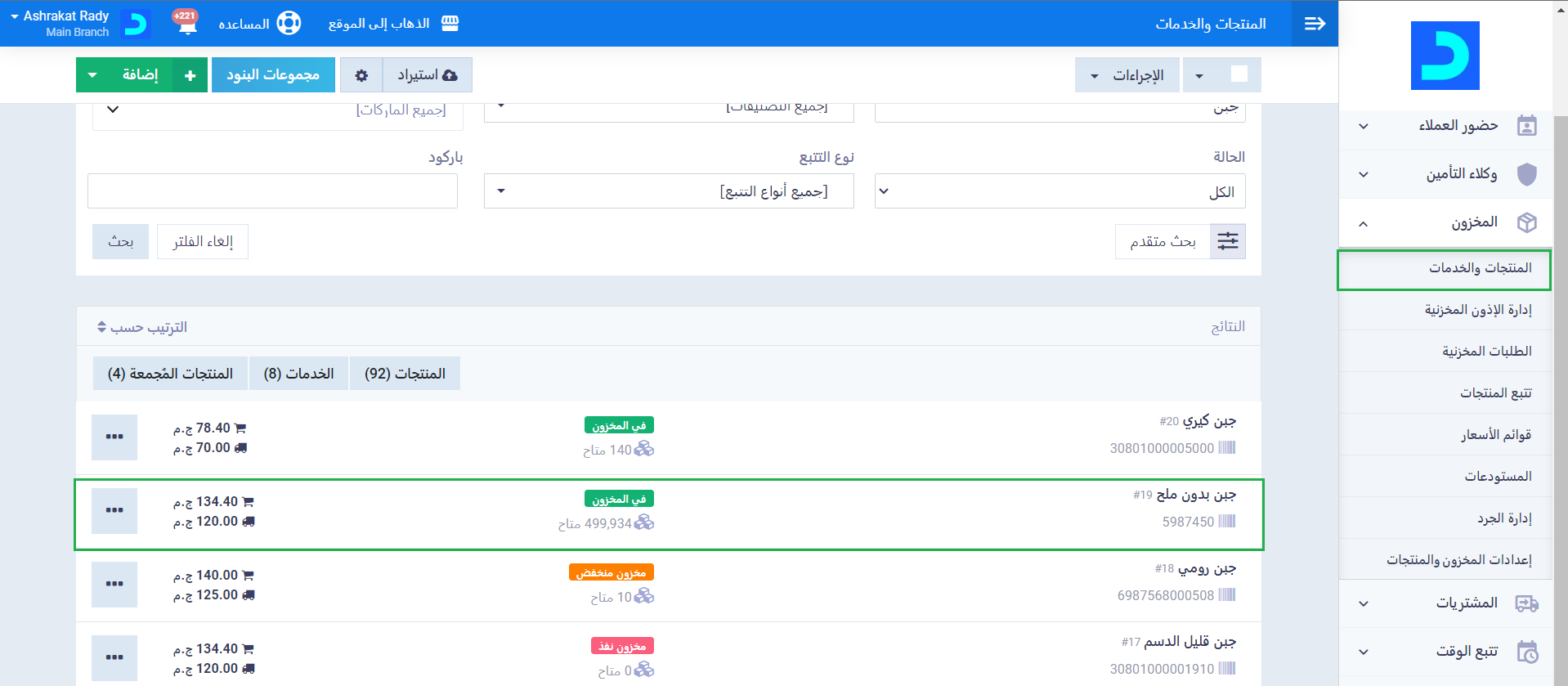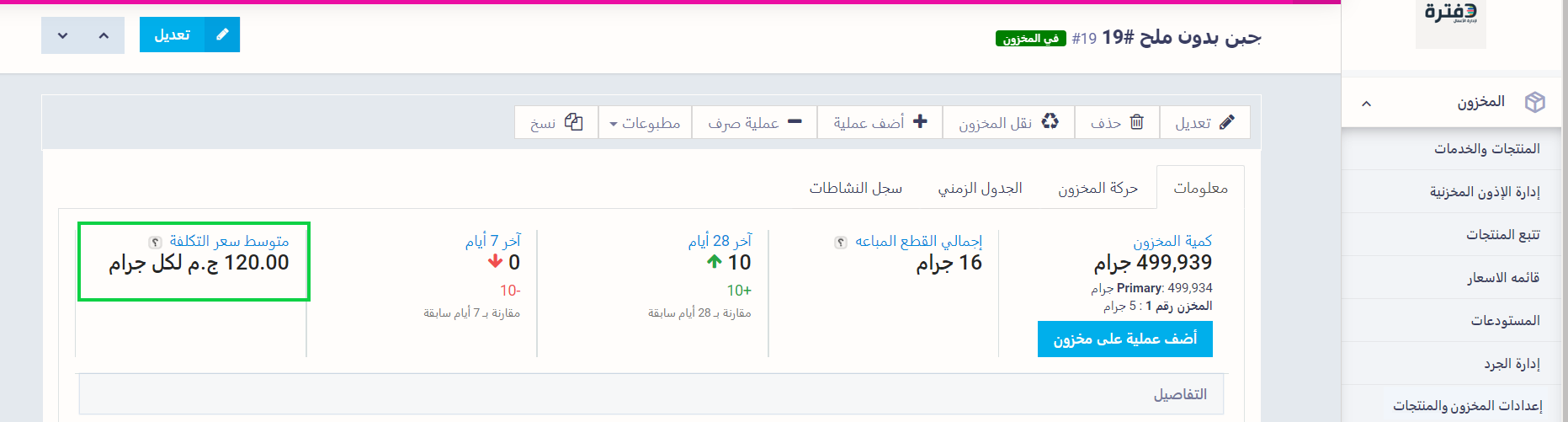 اضغط على “المنتجات والخدمات” المنسدلة عن “المخزون” بالقائمة الرئيسية. واضغط على المنتج الذي تود استعراض متوسط سعر التكلفة له.