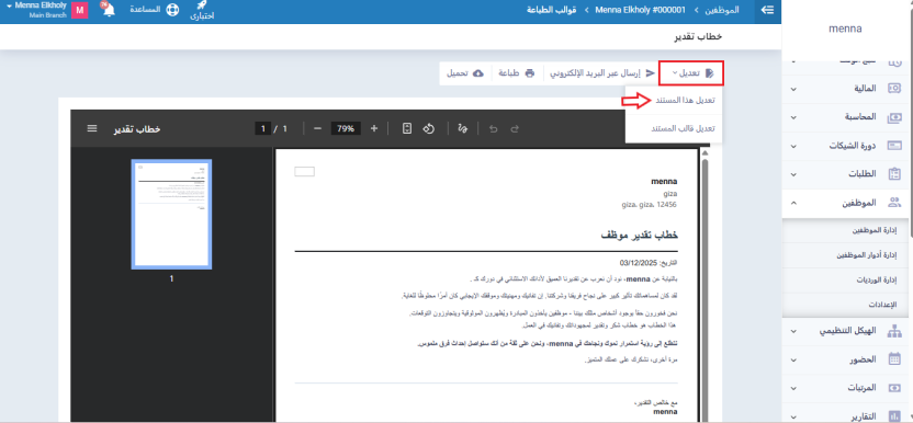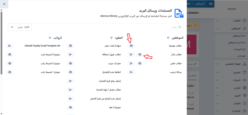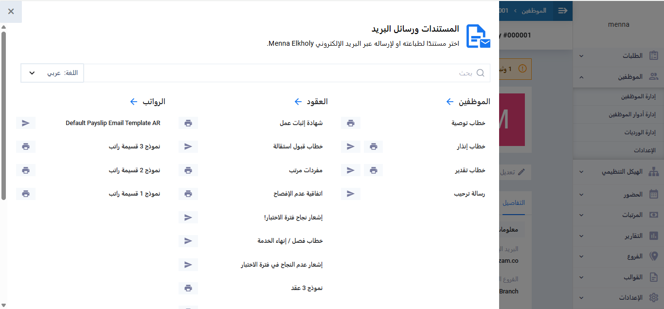 ستظهر لك قائمة بالمستندات الجاهزة مثل خطاب تقدير للموظف أو خطاب إنذار وغيرها.