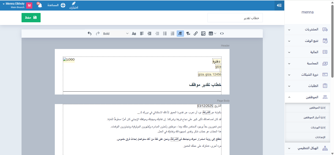 ستنتقل مباشرة إلى شاشة الخطاب حيث يمكنك كتابة التعديلات المطلوبة. عند الانتهاء اضغط على زر “حفظ”.