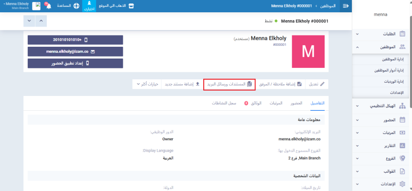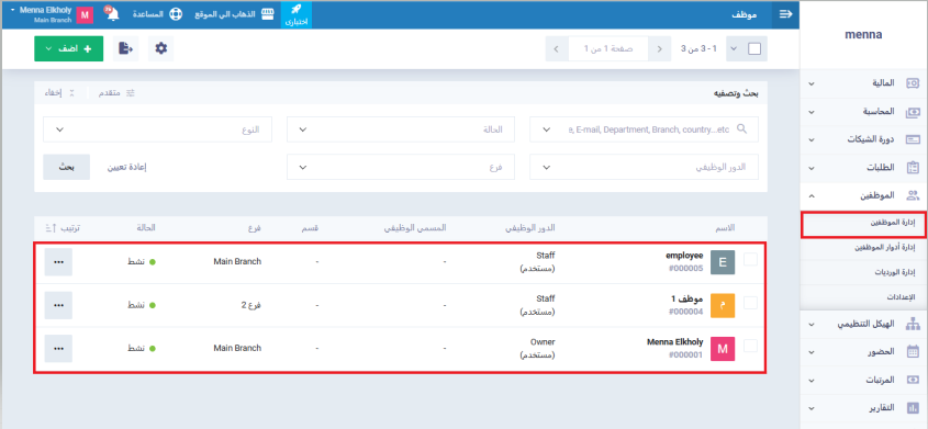انتقل إلى “الموظفين” من القائمة الرئيسية، ثم احتر “إدارة الموظفين”. بعد ذلك، اختر اسم الموظف المطلوب.