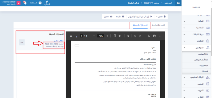 للاطلاع على تاريخ الخطابات المرسلة لنفس الموظف، عد إلى تبويب “المستندات ورسائل البريد” واختر الخطاب التي تريد متابعته. سيفتح النظام النسخة الأساسية للخطاب تلقائيًا، ثم اضغط على تبويب “الإصدارات السابقة” لتظهر لك جميع الإصادارات التي تم إرسالها للموظف، مع بيان التاريخ والوقت للخطاب.