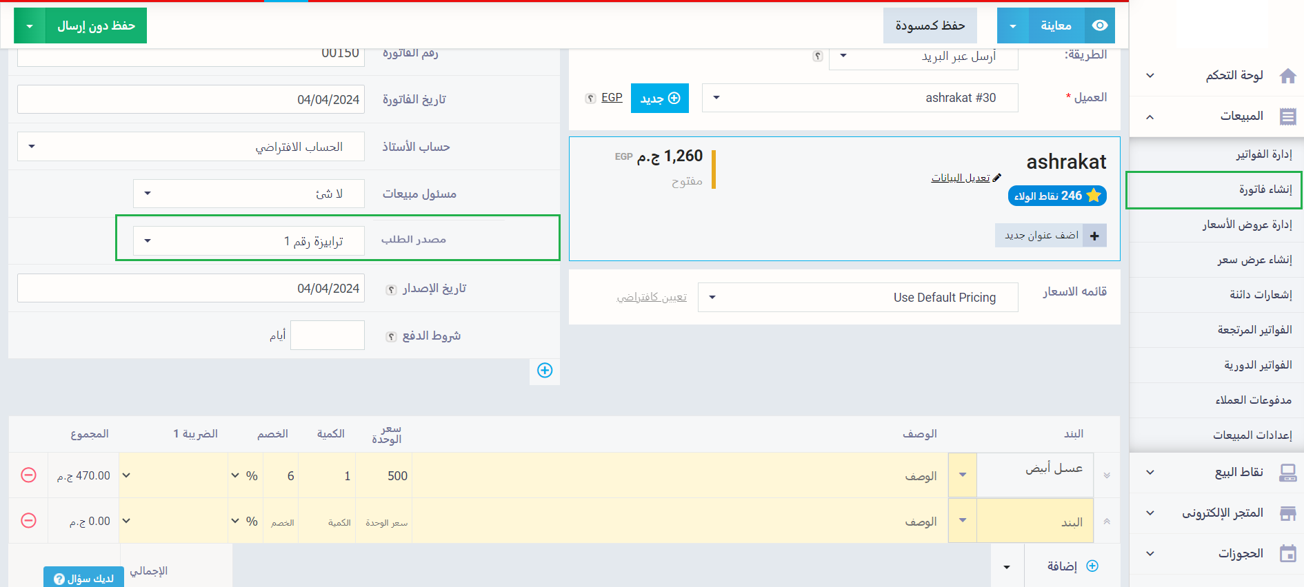 لتحديد مصدر الطلب الخاص بأحد فواتير المبيعات اضغط على “إنشاء فاتورة” المنسدلة عن “المبيعات” بالقائمة الرئيسية واختر من القائمة المنسدلة عن مصادر الطلب مصدر الطلب الخاص بالفاتورة.