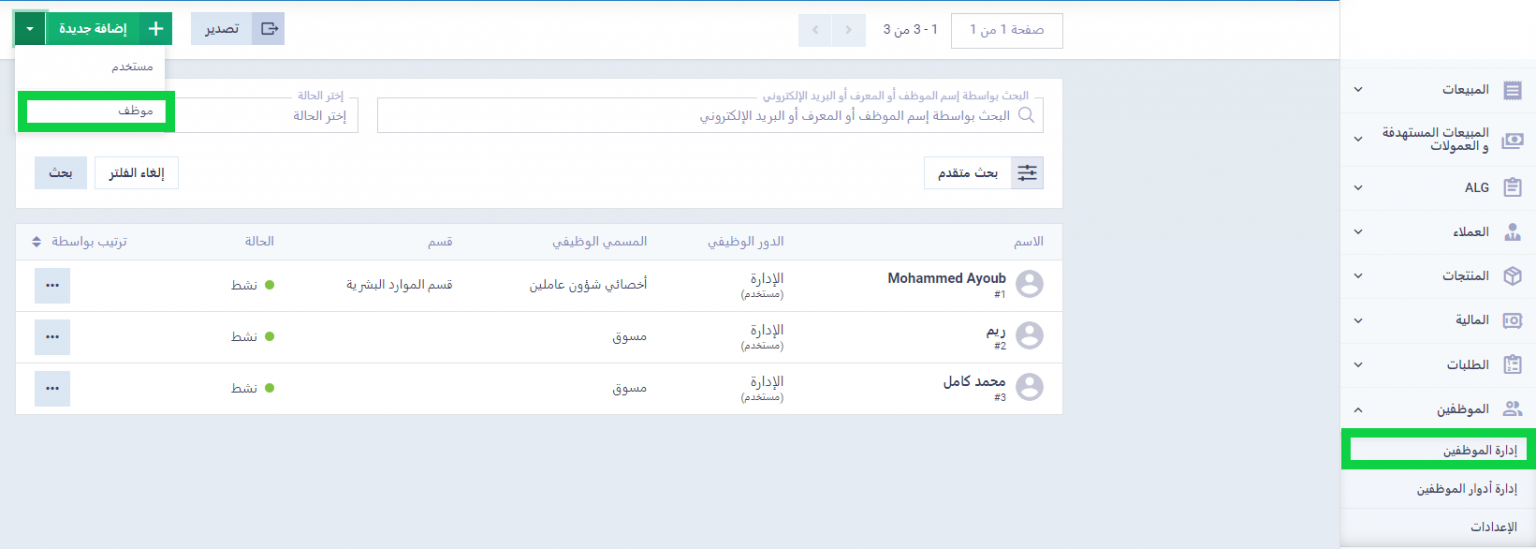 بداية اختر إدارة الموظفين من قسم الموظفين بالقائمة الرئيسية في دفترة، واضغط على السهم بجانب زر إضافة جديد، واختر موظف، هذا في حالة الرغبة في تعيين الوردية لموظف جديد، أو اضغط على الملف الشخصي المراد تعيين وردية له إن كان موظفًا موجودًا بالفعل.