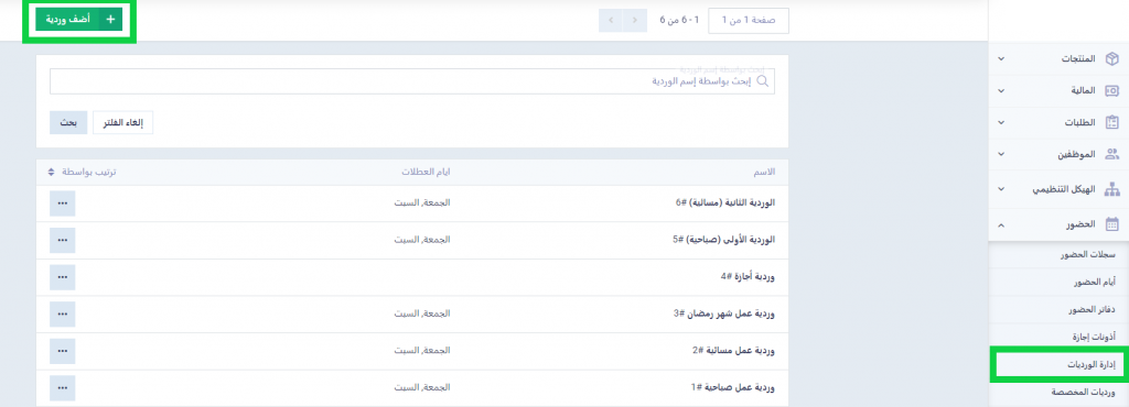 المعلومات التي تحتاجها لإتمام إنشاء وردية بسيطة للغاية، كل ما عليك فعله أن تتوجه إلى قسم “إدارة الورديات” المنسدل عن “الحضور” بالقائمة الرئيسية، لتظهر لك الورديات السابقة كلها، ويتاح لك إضافة وردية جديدة من خلال الضغط على زر “أضف وردية”.