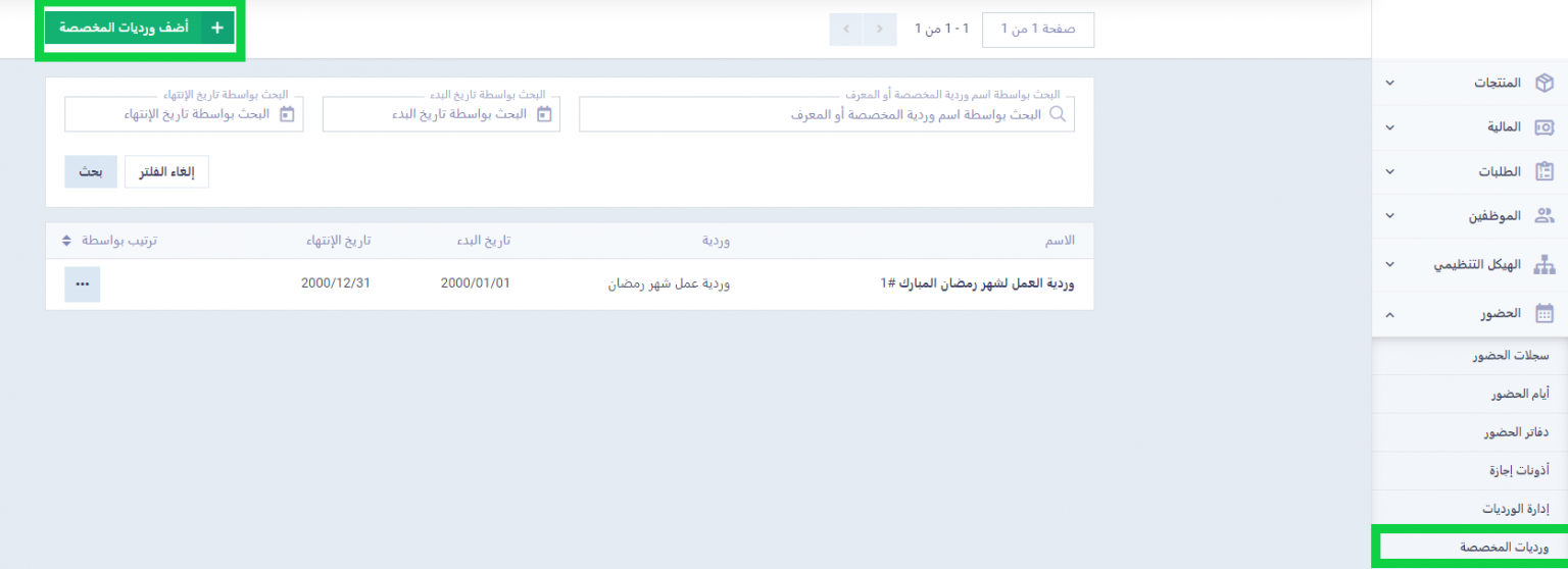 من الورديات المخصصة الموجودة بقسم الحضور في القائمة الرئيسية في دفترة، قم بالضغط على زر أضف ورديات مخصصة: