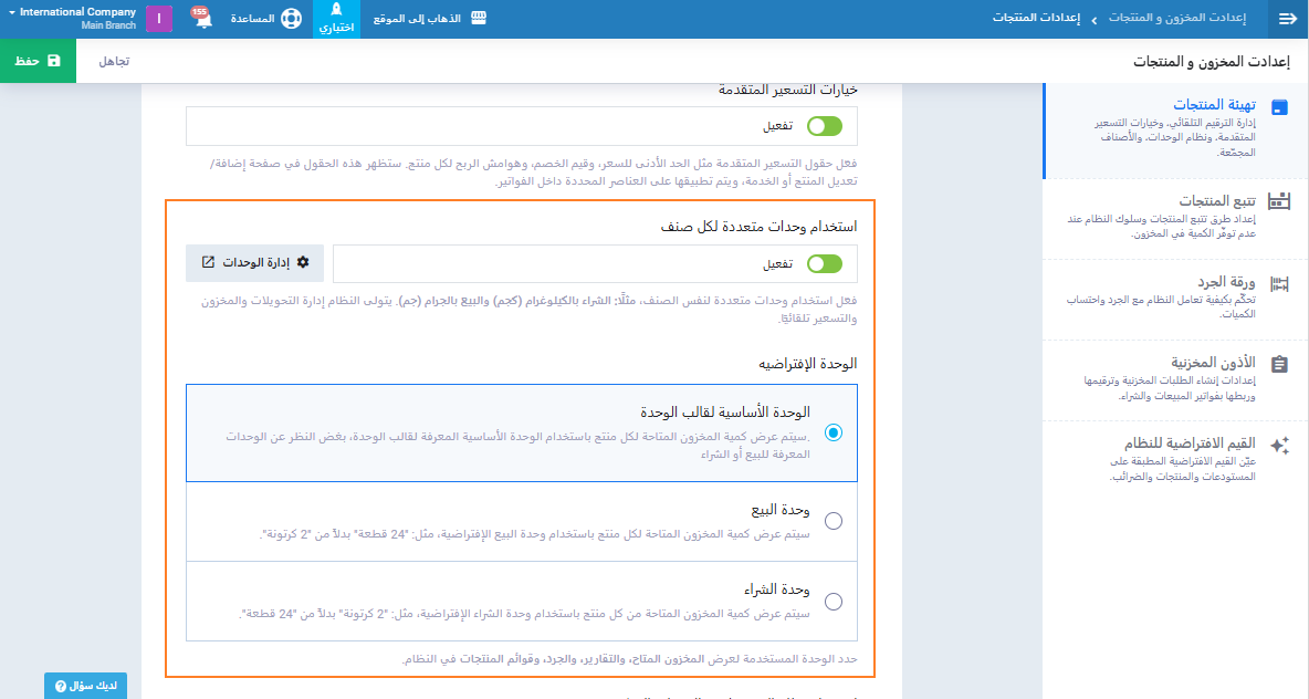 فعّل خاصية “إتاحة نظام الوحدات المتعددة” وعيّن “الوحدة الافتراضية” من القائمة المنسدلة، والاختيارات كالتالي: