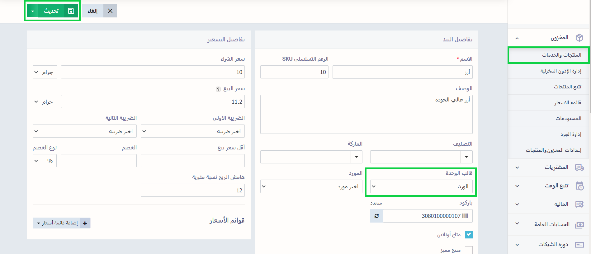 في “تفاصيل البند” اختر قالب وحدة القياس من القائمة المنسدلة، مثلًا “الوزن” ثم اضغط على زر “تحديث” أو “حفظ”.