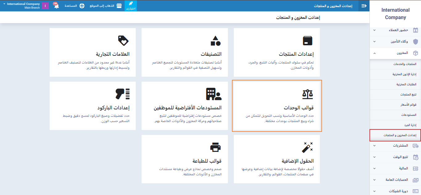 اضغط على “إعدادات المنتجات” المنسدلة عن “المخزون” بالقائمة الرئيسية، ثم اضغط على بطاقة “قوالب الوحدات”.